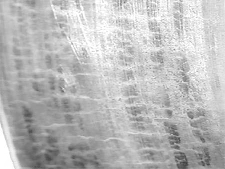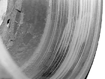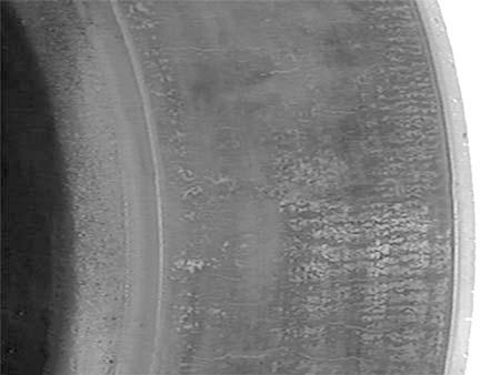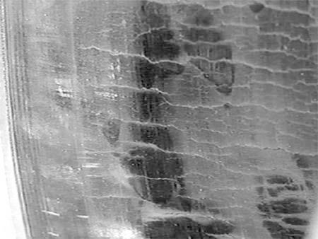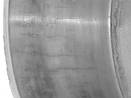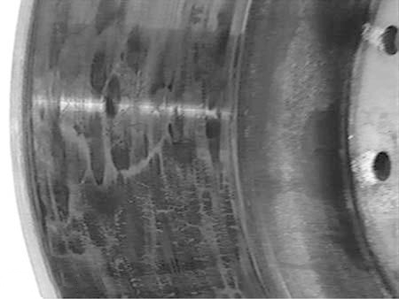 Uneven heating of the brake drum may cause local heat (black) spots. These can appear as uniform parallel rings covering the entire friction surface or as evenly distributed small circular spots in larger local areas. This is primarily caused by uneven wear due to material or structural defects in the brake drum. Prompt replacement is required when such spots become prominent.